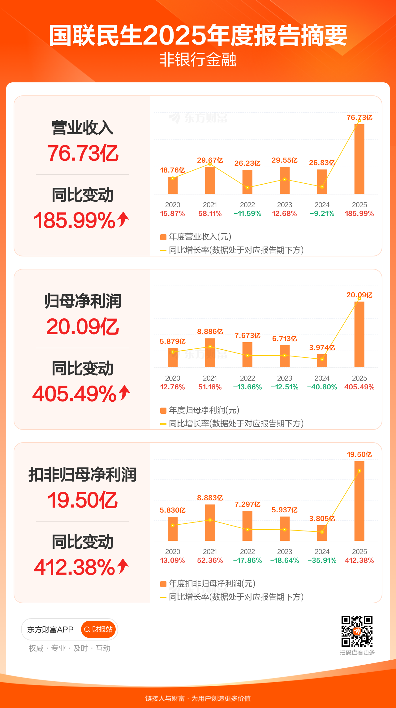 国联民生3月28日发布2025年年报显示,公司全年实现营业收入76.73亿元,同比增长185.99%;归母净利润20.09亿元,同比增长405.49%;扣非归母净利润19.50亿元,同比增长412.38%。