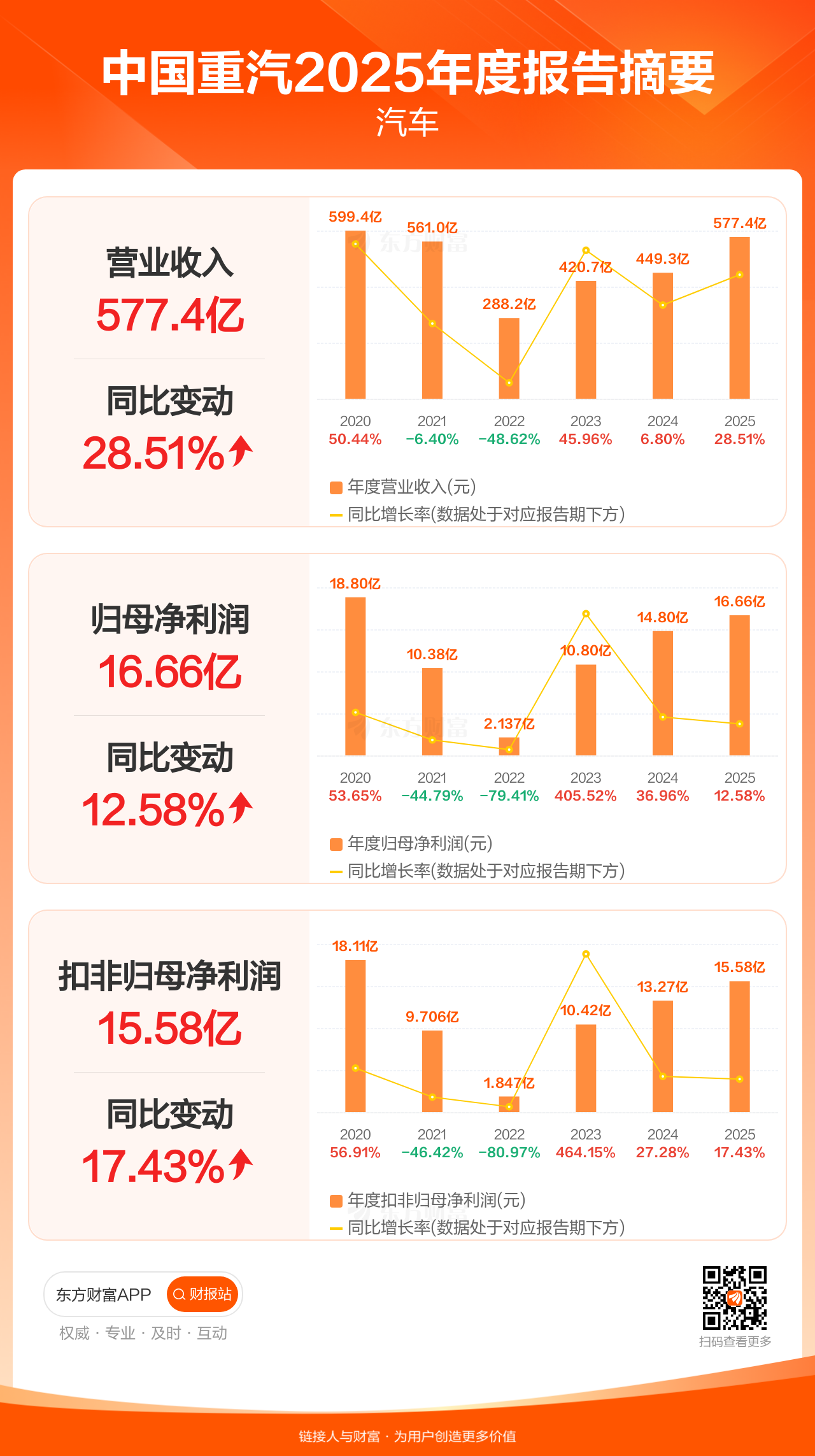 中国重汽3月28日发布2025年年报显示,公司全年实现营业收入577.37亿元,同比增长28.51%;归母净利润16.66亿元,同比增长12.58%;扣非归母净利润15.58亿元,同比增长17.43%。