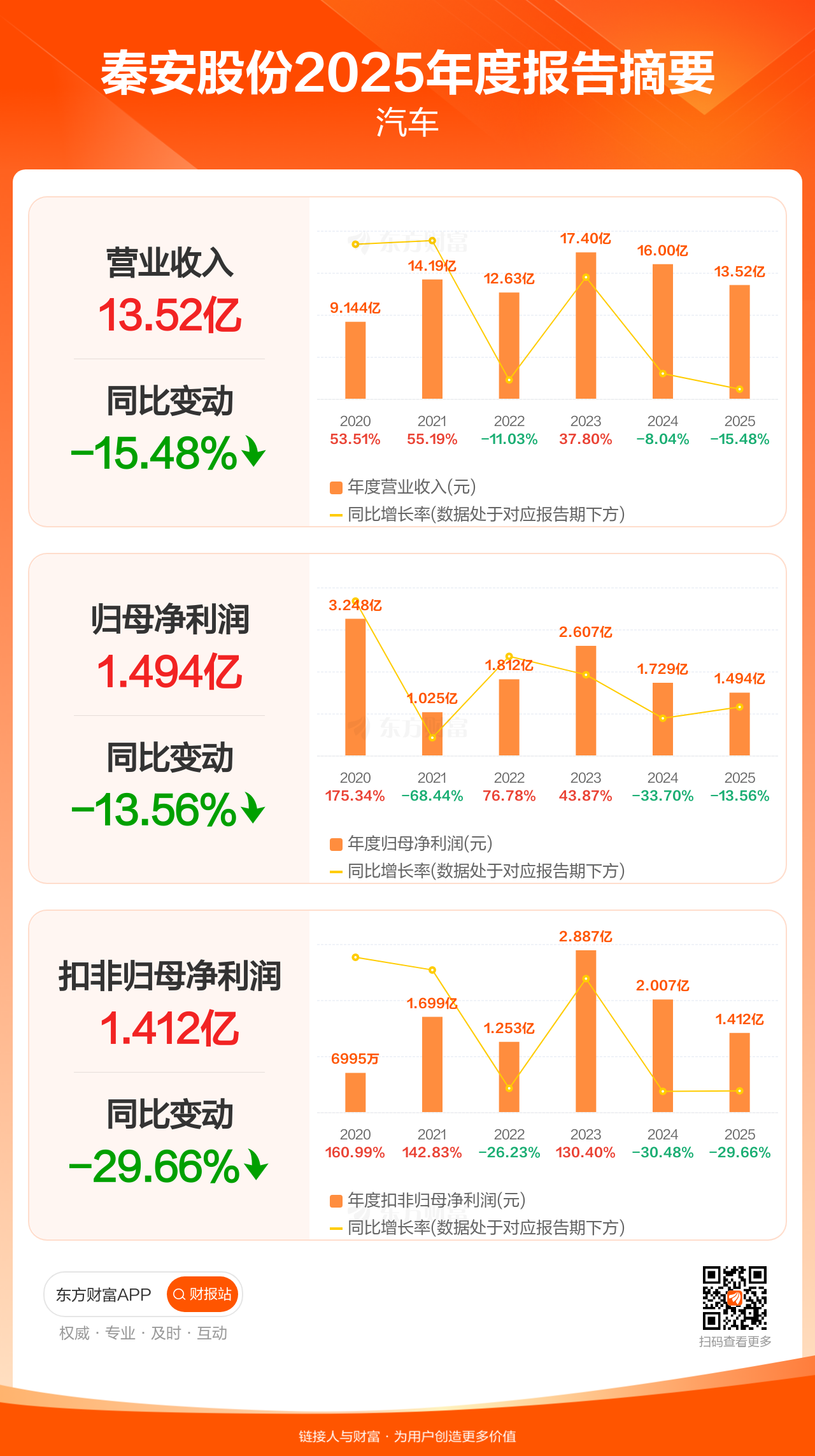 秦安股份3月28日发布2025年年报显示,公司全年实现营业收入13.52亿元,同比下滑15.48%;归母净利润1.49亿元,同比下滑13.56%;扣非归母净利润1.41亿元,同比下滑29.66%。每股EPS0.35元,低于机构一致预测的0.62元。
