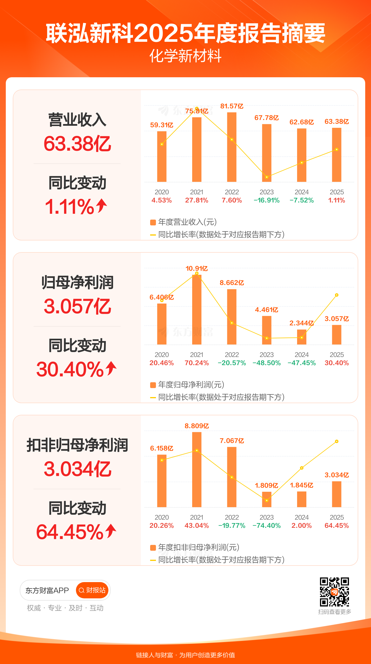 联泓新科3月28日发布2025年年报显示,公司全年实现营业收入63.38亿元,同比增长1.11%;归母净利润3.06亿元,同比增长30.40%;扣非归母净利润3.03亿元,同比增长64.45%。