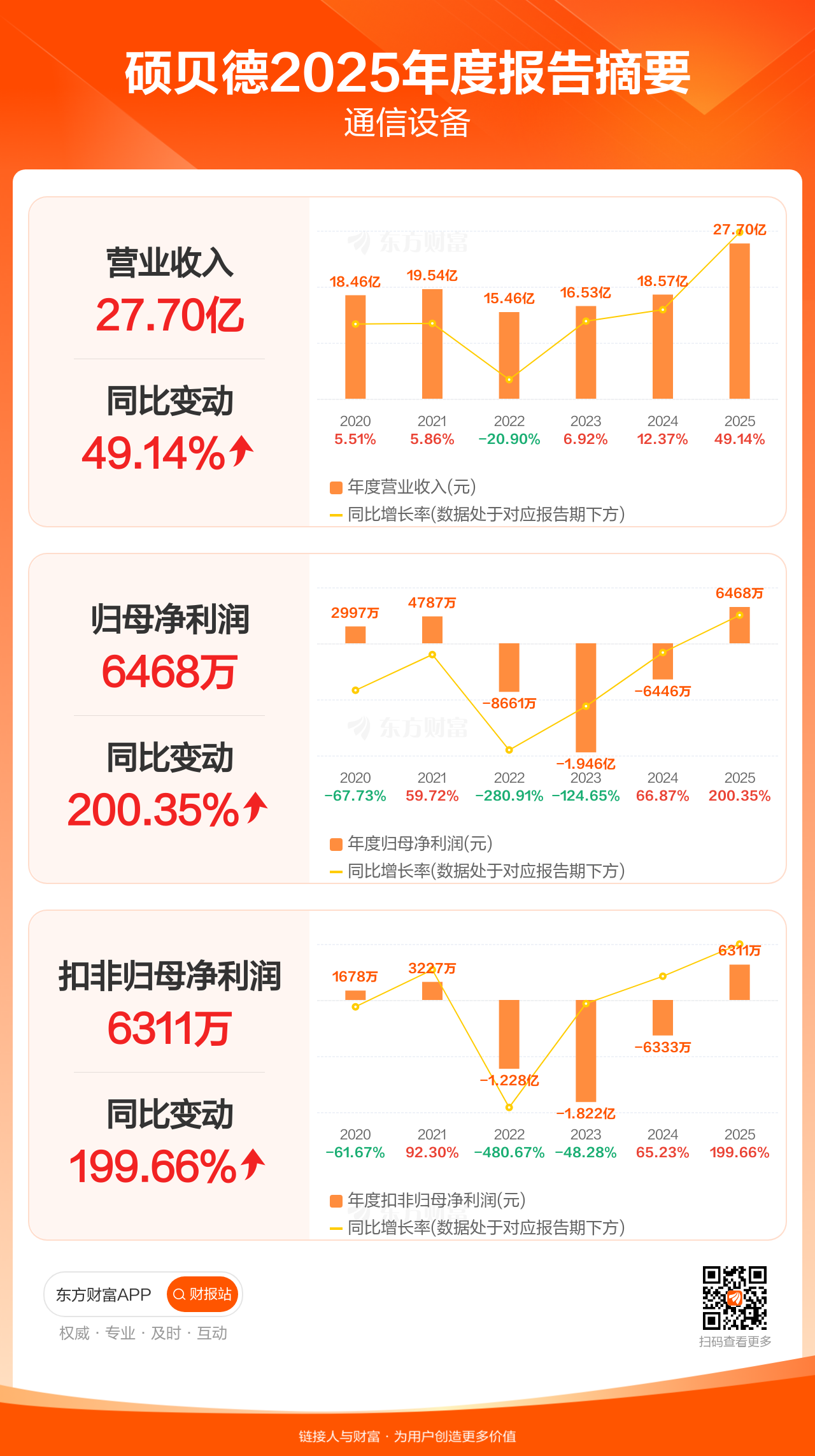 硕贝德3月28日发布2025年年报显示,公司全年实现营业收入27.70亿元,同比增长49.14%;归母净利润6468.43万元,同比增长200.35%;扣非归母净利润6310.97万元,同比增长199.66%。