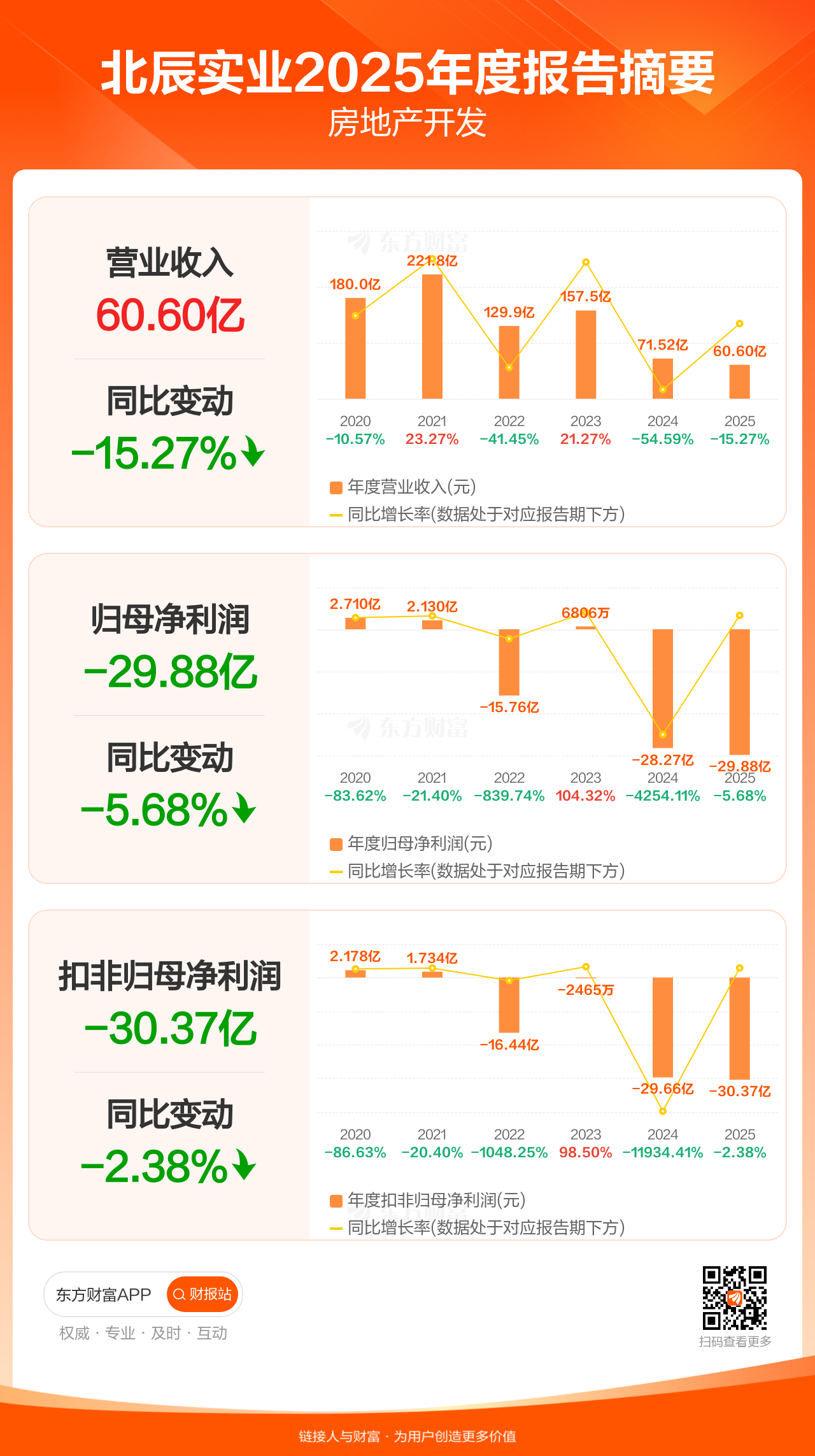 北辰实业3月28日发布2025年年报显示,公司全年实现营业收入60.60亿元,同比下滑15.27%;归母净利润-29.88亿元;扣非归母净利润-30.37亿元。