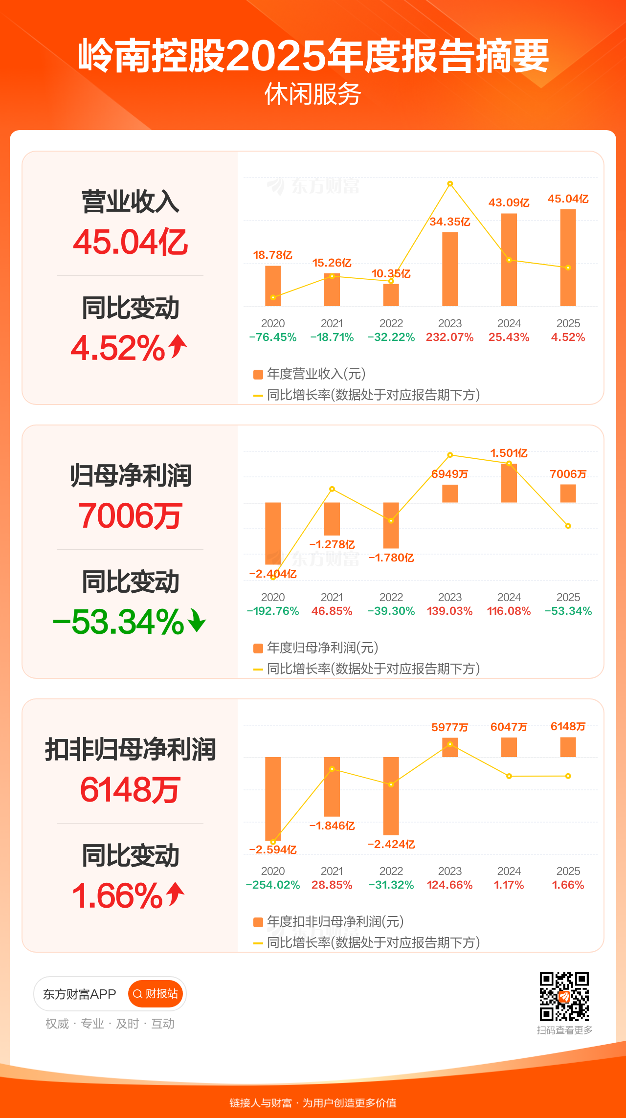 岭南控股3月28日发布2025年年报显示,公司全年实现营业收入45.04亿元,同比增长4.52%;归母净利润7006.10万元,同比下滑53.34%;扣非归母净利润6147.65万元,同比增长1.66%。