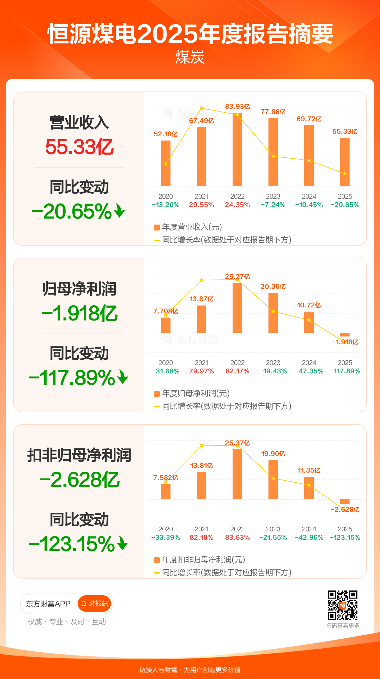 恒源煤电3月28日发布2025年年报显示,公司全年实现营业收入55.33亿元,同比下滑20.65%;归母净利润-1.92亿元;扣非归母净利润-2.63亿元。