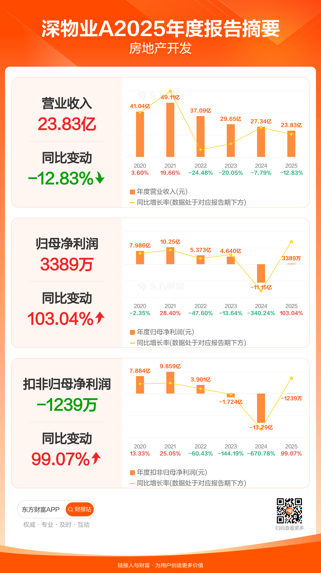 深物业A3月28日发布2025年年报显示,公司全年实现营业收入23.83亿元,同比下滑12.83%;归母净利润3388.51万元,同比增长103.04%;扣非归母净利润-1238.64万元。