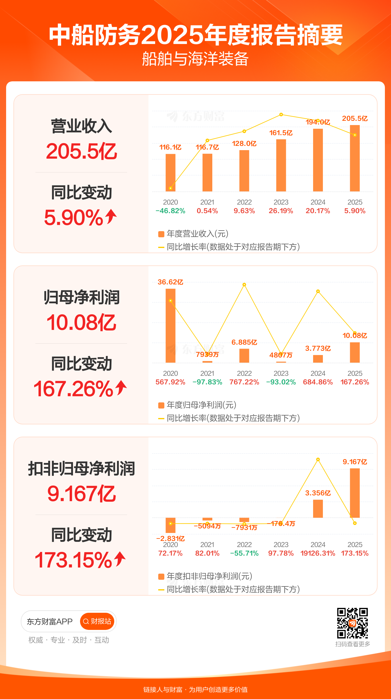 中船防务3月28日发布2025年年报显示,公司全年实现营业收入205.47亿元,同比增长5.90%;归母净利润10.08亿元,同比增长167.26%;扣非归母净利润9.17亿元,同比增长173.15%。