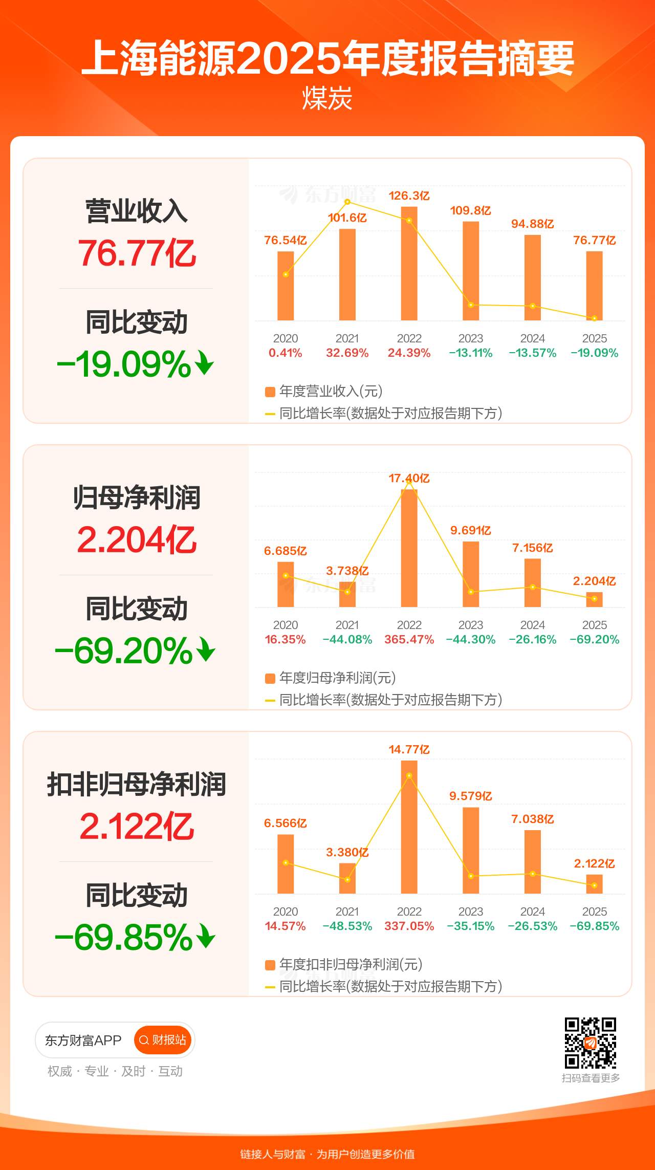 上海能源3月28日发布2025年年报显示,公司全年实现营业收入76.77亿元,同比下滑19.09%;归母净利润2.20亿元,同比下滑69.20%;扣非归母净利润2.12亿元,同比下滑69.85%。