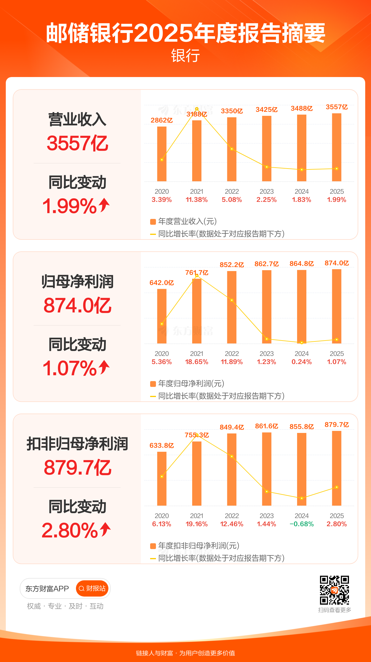 邮储银行3月28日发布2025年年报显示,公司全年实现营业收入3557.28亿元,同比增长1.99%;归母净利润874.04亿元,同比增长1.07%;扣非归母净利润879.71亿元,同比增长2.80%。