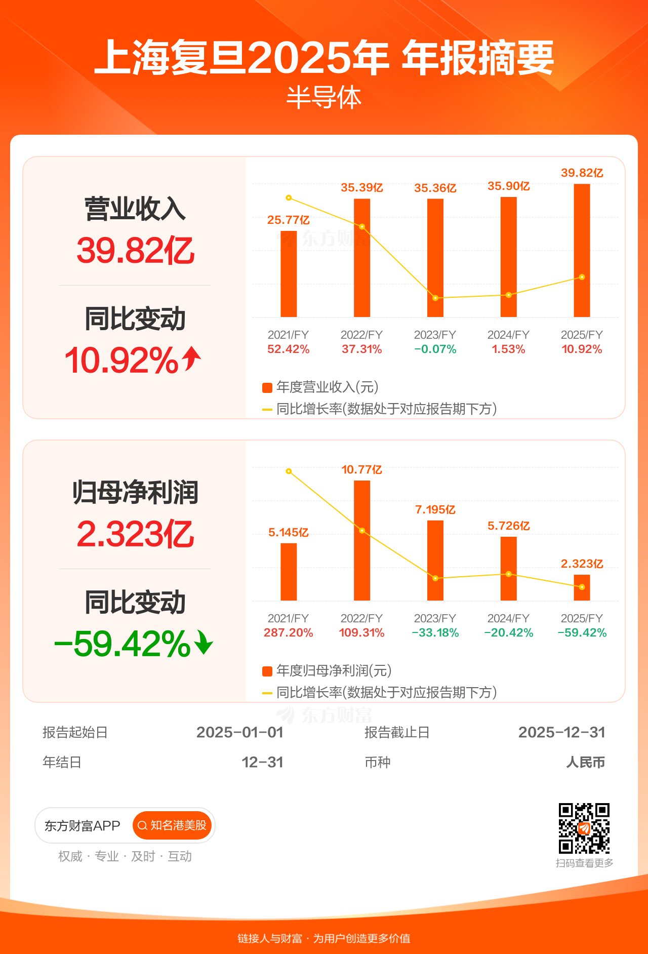 上海复旦3月27日发布年报业绩,截至2025年12月31日的12个月内,该公司营业收入39.82亿人民币,同比增长10.92%;公司权益持有人应占溢利(归母净利润)2.32亿人民币,同比减少59.42%,低于机构一致预测的9.98亿人民币。