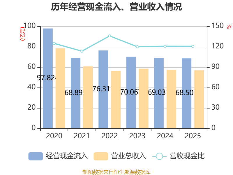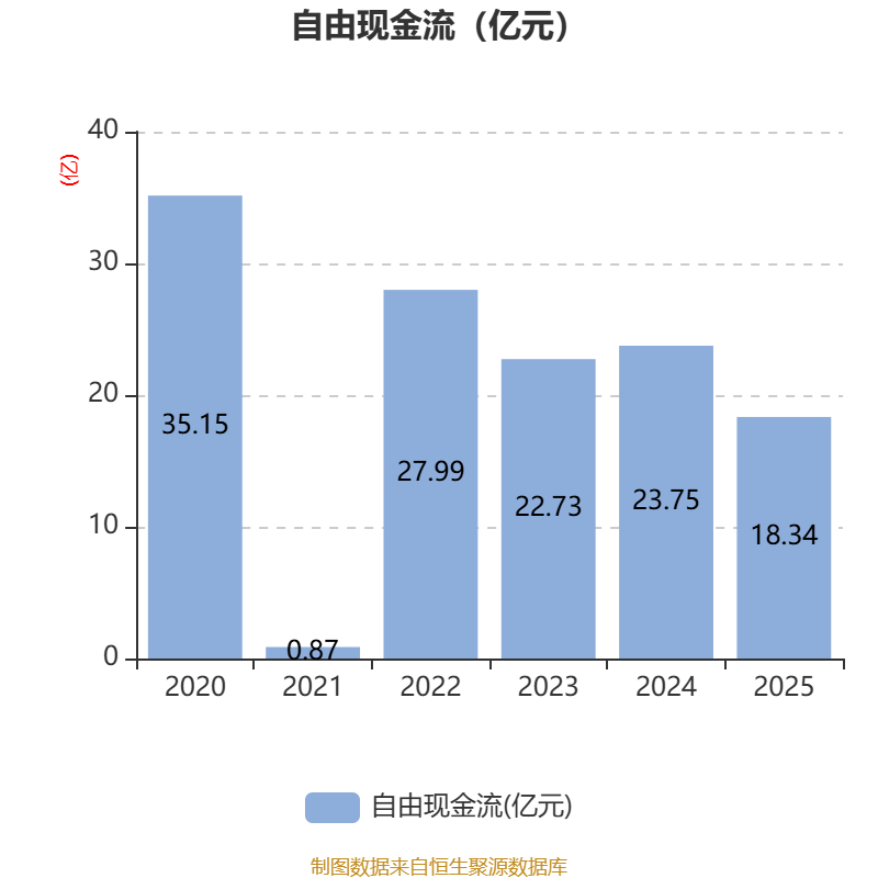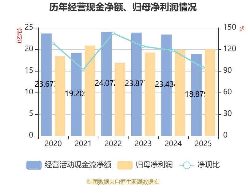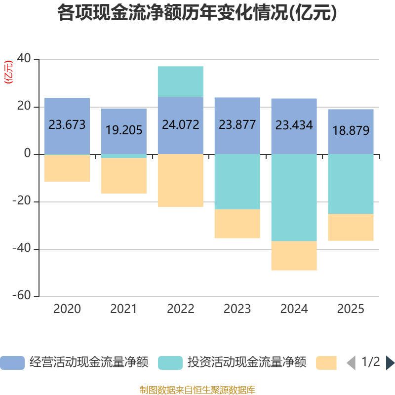 截至2025年,公司经营活动现金流净额为18.88亿元,同比下降19.44%;筹资活动现金流净额-11.34亿元,同比增加9674.79万元;投资活动现金流净额-25.27亿元,上年同期为-36.79亿元。