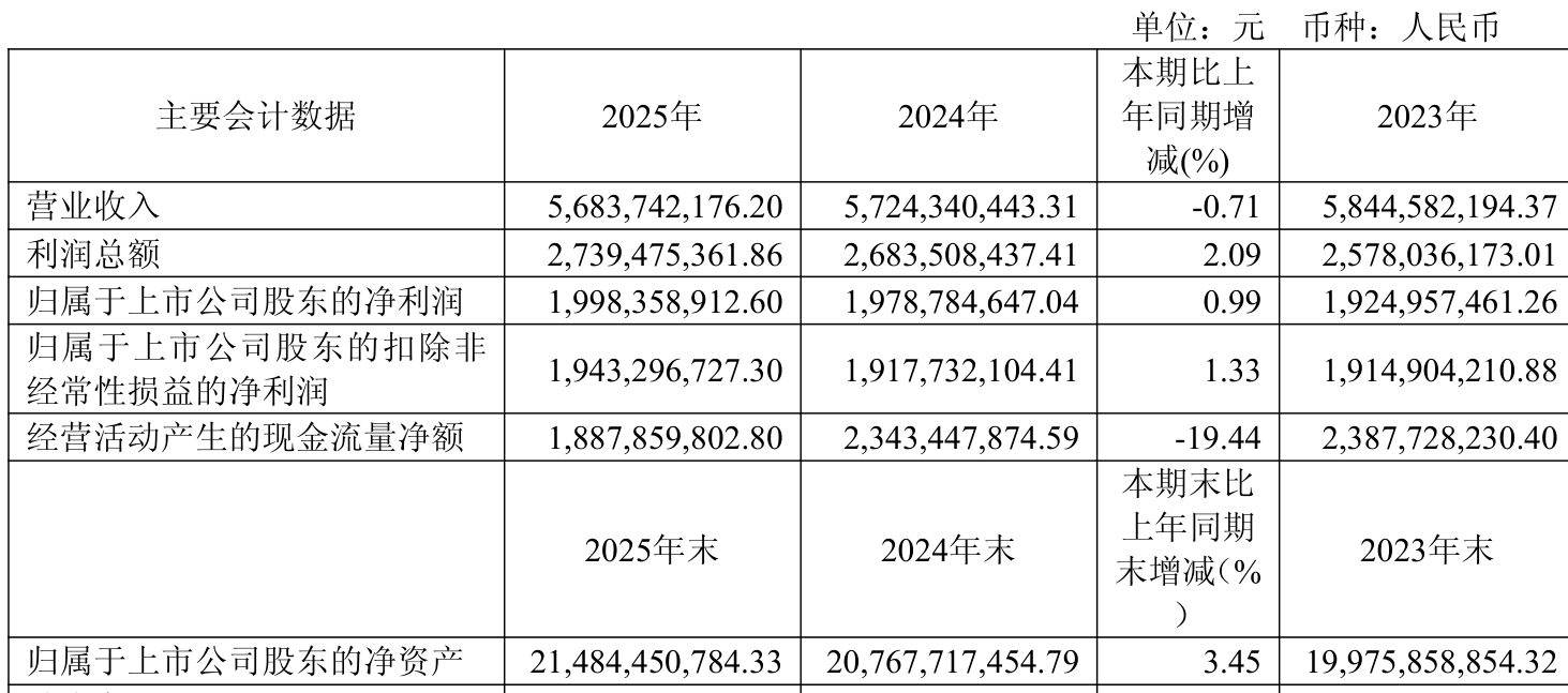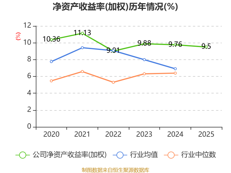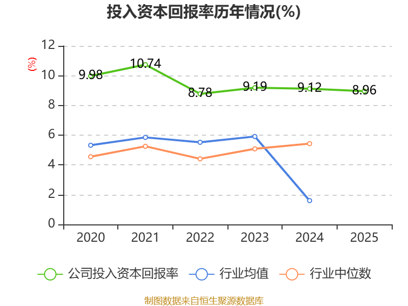数据显示,2025年公司加权平均净资产收益率为9.5%,较上年同期下降0.26个百分点。公司2025年投入资本回报率为8.96%,较上年同期下降0.16个百分点。