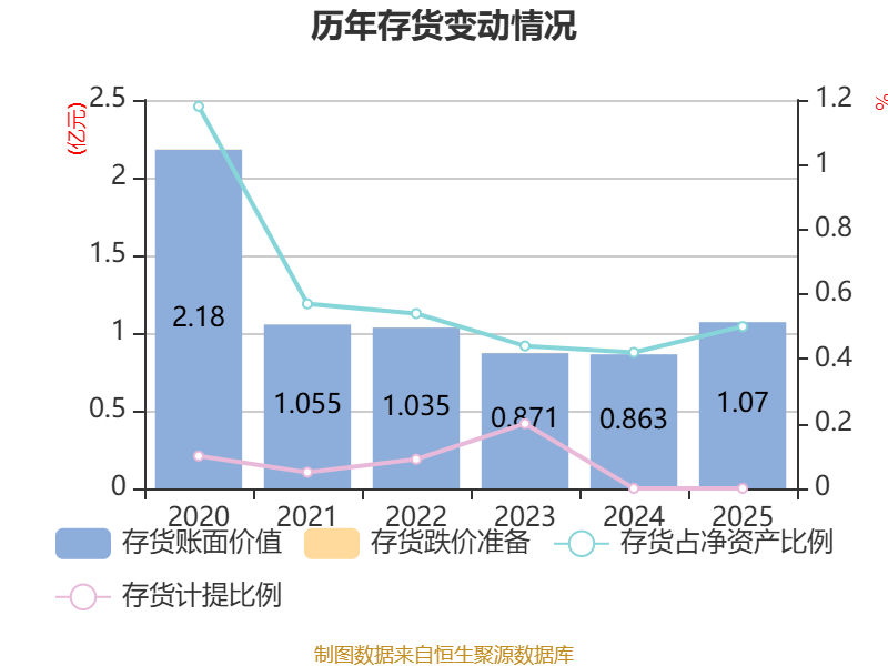 从存货变动来看,截至2025年末,公司存货账面价值为1.07亿元,占净资产的0.5%,较上年末增加2068.16万元。公司本期没有计提存货跌价准备。
