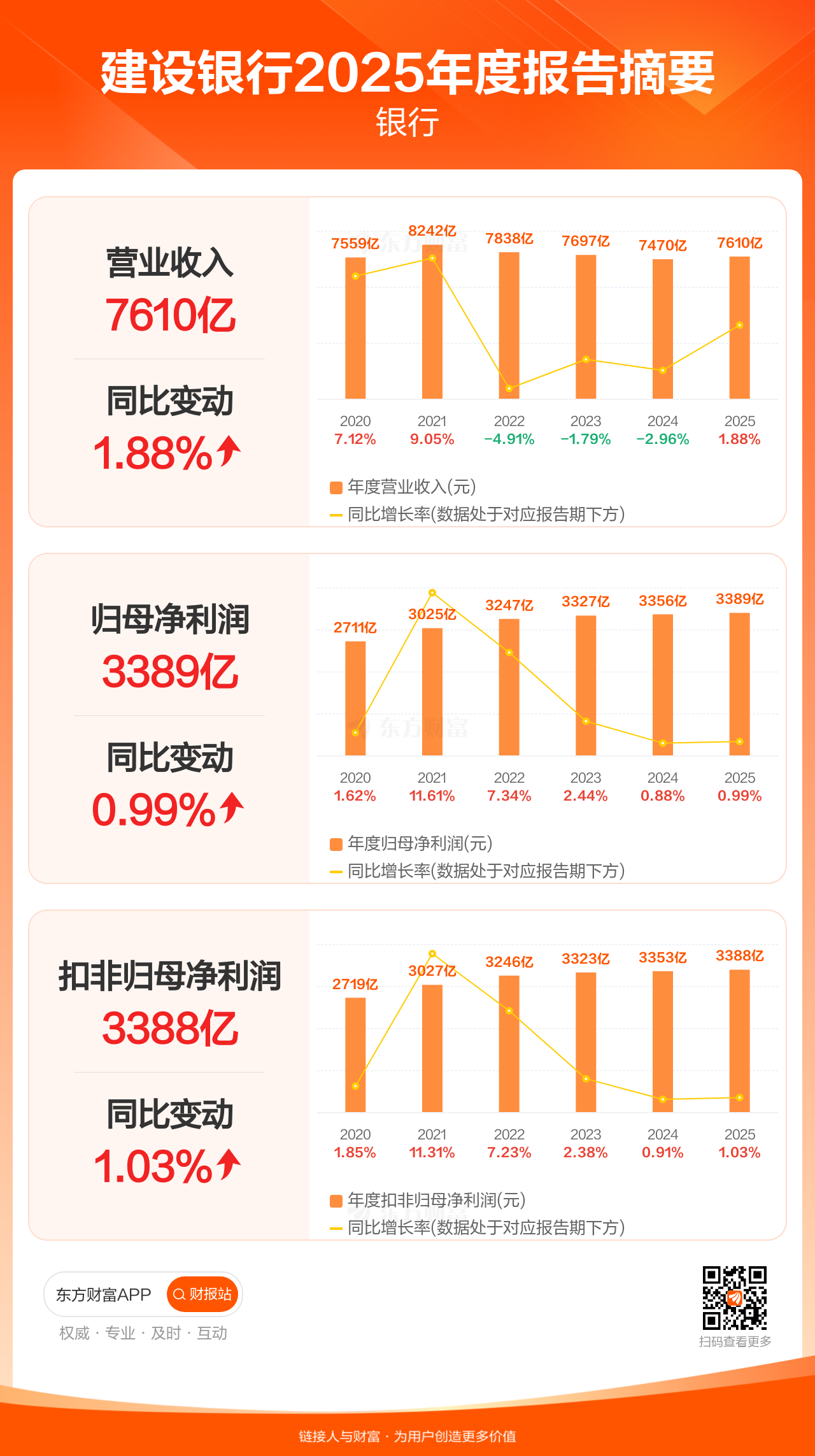 建设银行3月28日发布2025年年报显示,公司全年实现营业收入7610.49亿元,同比增长1.88%;归母净利润3389.06亿元,同比增长0.99%;扣非归母净利润3387.83亿元,同比增长1.03%。