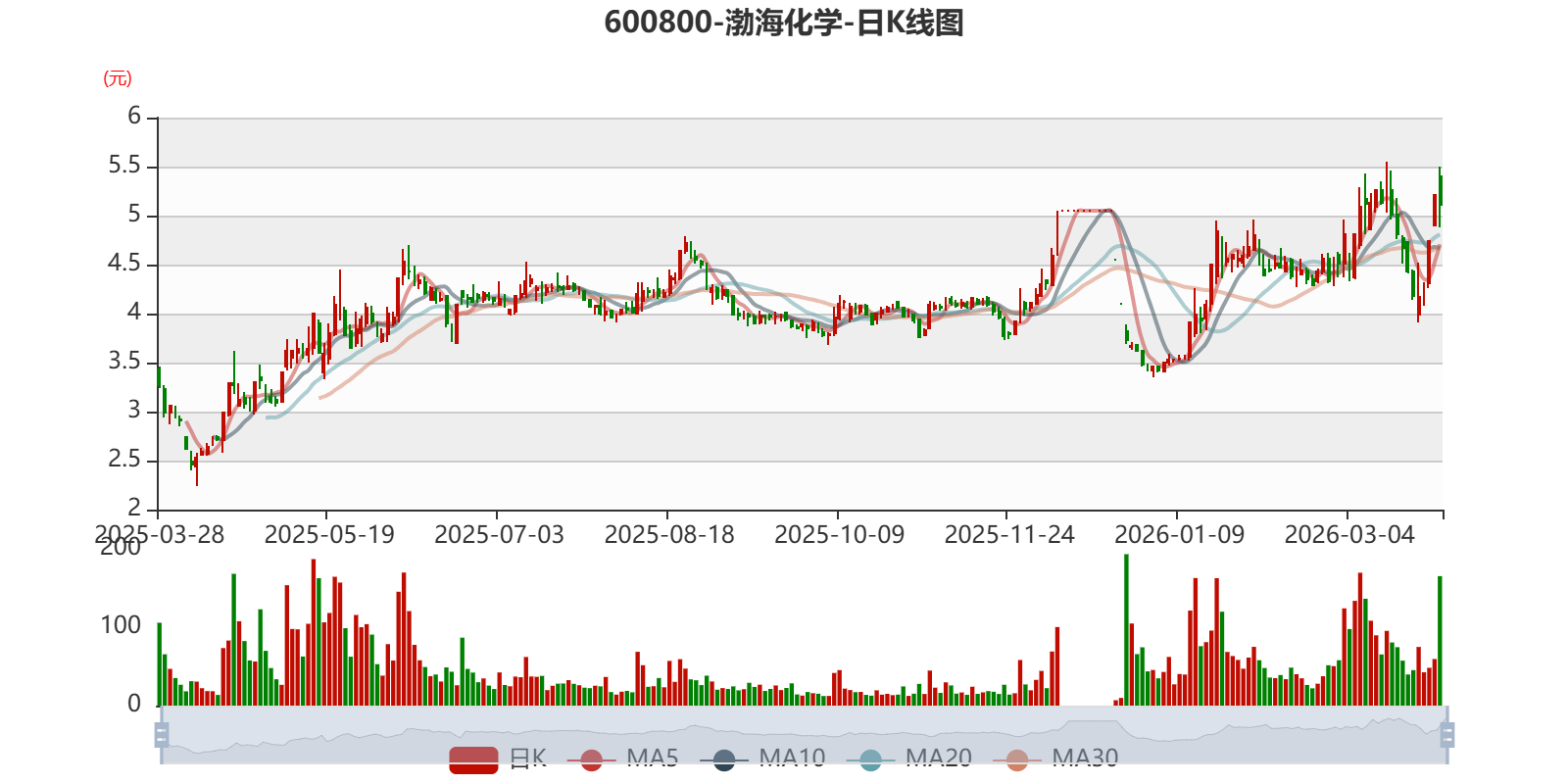 中证智能财讯渤海化学(600800)3月27日晚间披露2025年业绩快报,公司实现营业收入33.3亿元,同比下降30.39%;归母净利润亏损6.46亿元,上年同期亏损6.32亿元;扣非净利润亏损7.75亿元,上年同期亏损6.93亿元;基本每股收益-0.58元,加权平均净资产收益率为-44.9%。以最新收盘价计算,市净率(LF)约4.77倍,市销率(TTM)约1.35倍。