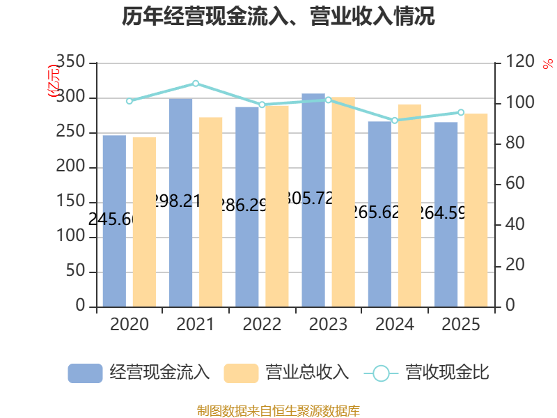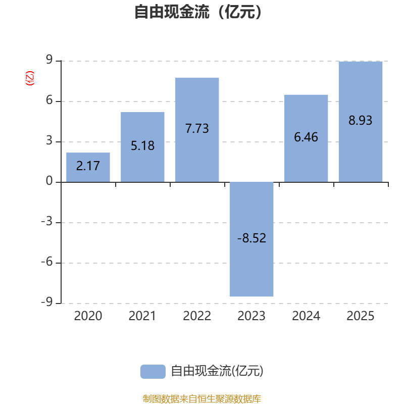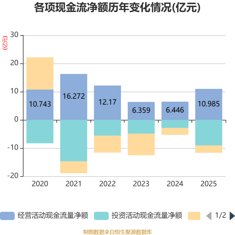 截至2025年,公司经营活动现金流净额为10.98亿元,同比增长70.41%;筹资活动现金流净额-2.61亿元,同比减少1733.32万元;投资活动现金流净额-9.07亿元,上年同期为-2.88亿元。