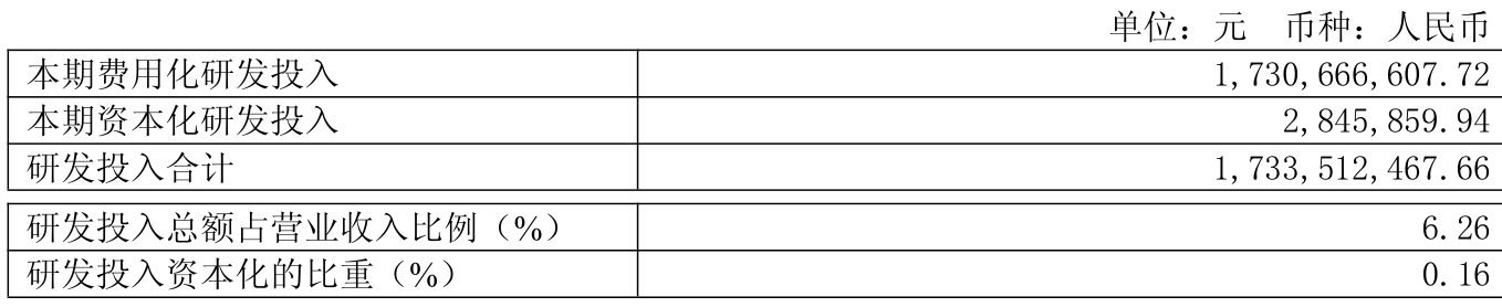 2025年全年,公司研发投入金额为17.34亿元,同比下降5.46%;研发投入占营业收入比例为6.26%,相比上年同期下降0.06个百分点。此外,公司全年研发投入资本化率为0.16%。