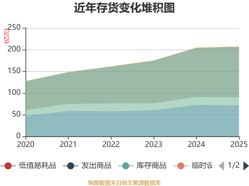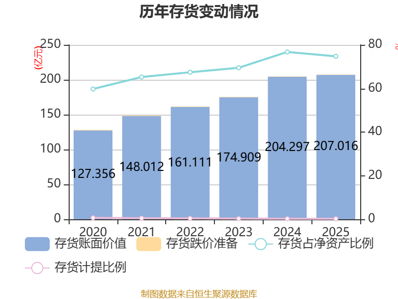 从存货变动来看,截至2025年末,公司存货账面价值为207.02亿元,占净资产的74.74%,较上年末增加2.72亿元。其中,存货跌价准备为4907.28万元,计提比例为0.24%。