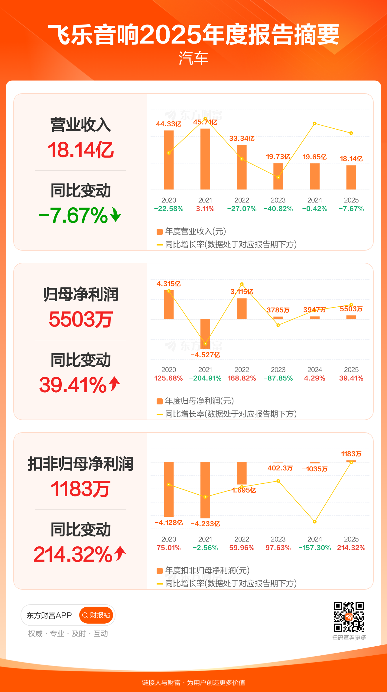 飞乐音响3月28日发布2025年年报显示,公司全年实现营业收入18.14亿元,同比下滑7.67%;归母净利润5503.08万元,同比增长39.41%;扣非归母净利润1183.35万元,同比增长214.32%。