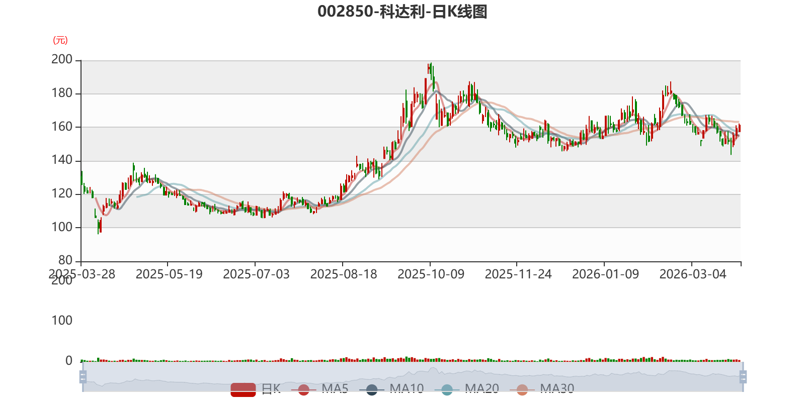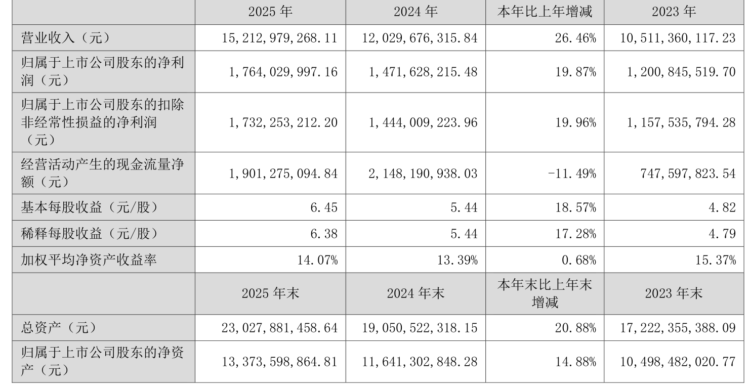 中证智能财讯科达利(002850)3月28日披露2025年年度报告。2025年,公司实现营业总收入152.13亿元,同比增长26.46%;归母净利润17.64亿元,同比增长19.87%;扣非净利润17.32亿元,同比增长19.96%;经营活动产生的现金流量净额为19.01亿元,同比下降11.49%;报告期内,科达利基本每股收益为6.45元,加权平均净资产收益率为14.07%。公司2025年度分配预案为:拟向全体股东每10股派现25元(含税)。