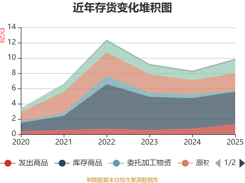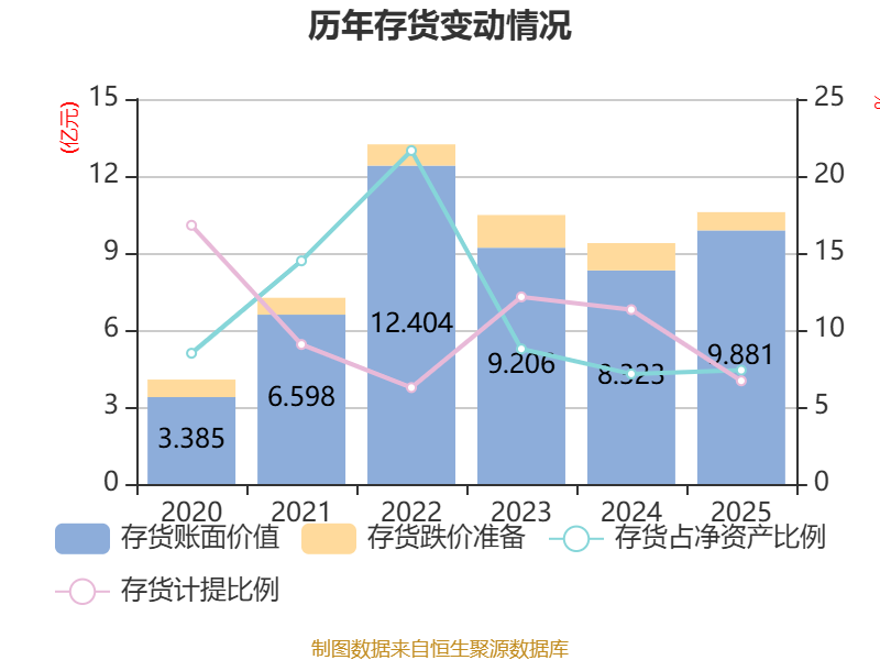 从存货变动来看,截至2025年末,公司存货账面价值为9.88亿元,占净资产的7.39%,较上年末增加1.56亿元。其中,存货跌价准备为7099.11万元,计提比例为6.7%。