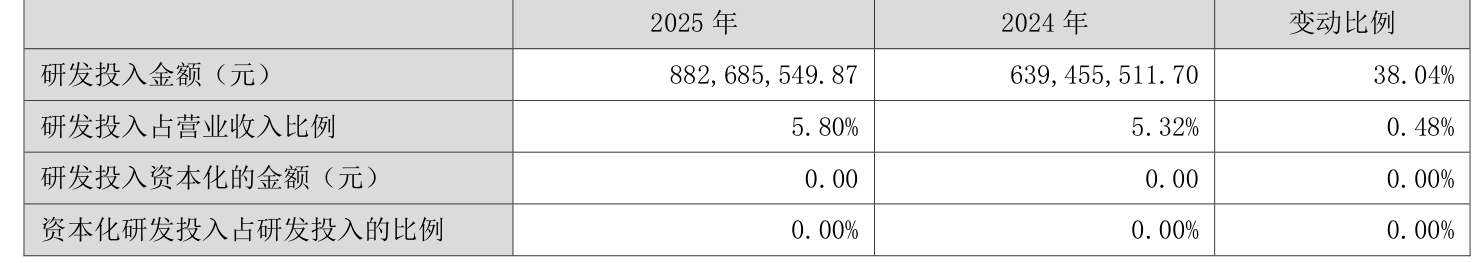 2025年全年,公司研发投入金额为8.83亿元,同比增长38.04%;研发投入占营业收入比例为5.8%,相比上年同期上升0.48个百分点。此外,公司全年研发投入资本化率为0%。