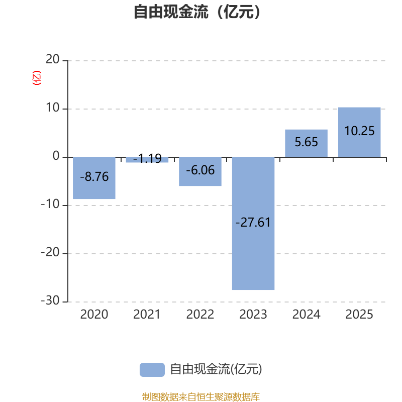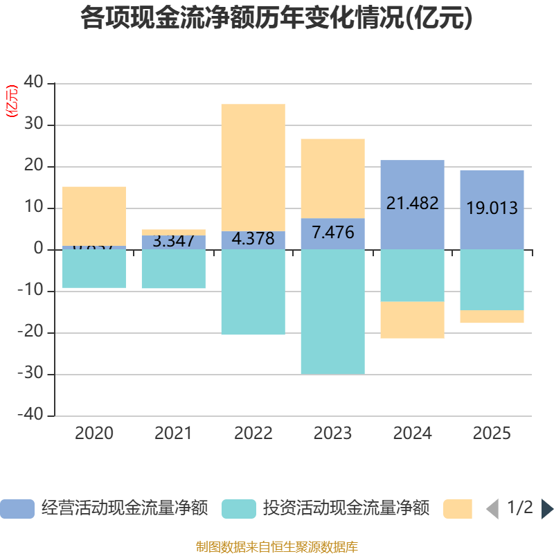 截至2025年,公司经营活动现金流净额为19.01亿元,同比下降11.49%;筹资活动现金流净额-3.02亿元,同比增加5.79亿元;投资活动现金流净额-14.67亿元,上年同期为-12.62亿元。