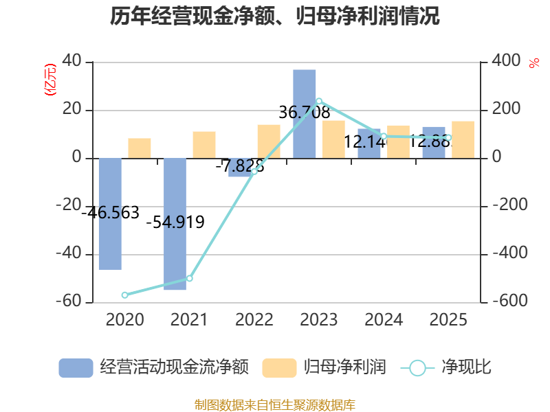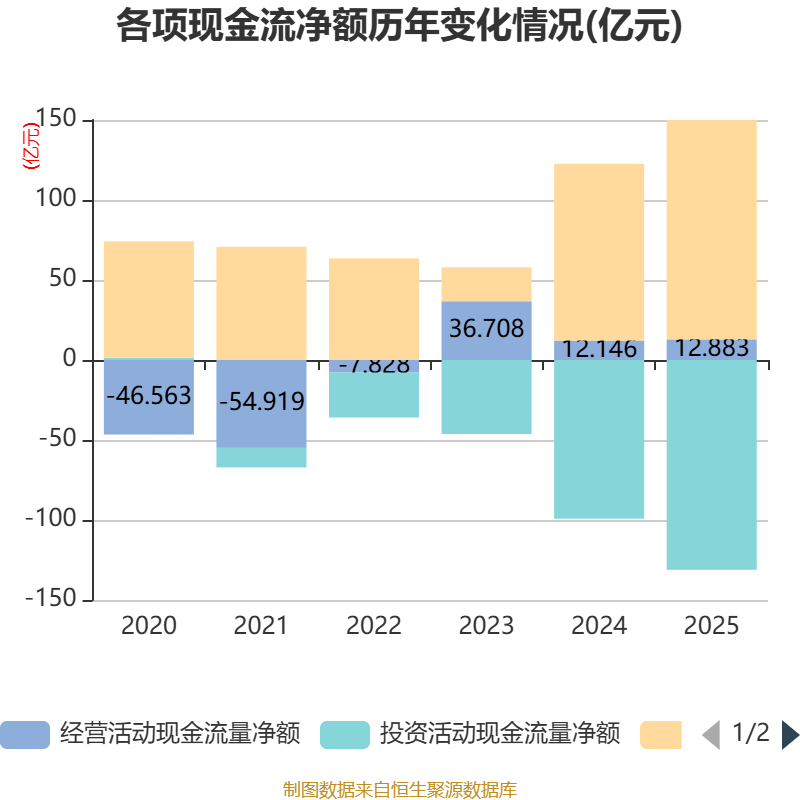 截至2025年,公司经营活动现金流净额为12.88亿元,同比增长6.07%;筹资活动现金流净额137.07亿元,同比增加26.55亿元;投资活动现金流净额-131.13亿元,上年同期为-99.18亿元。
