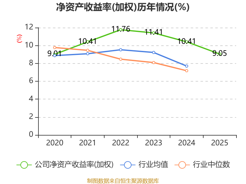 数据显示,2025年公司加权平均净资产收益率为9.05%,较上年同期下降1.36个百分点。公司2025年投入资本回报率为3.24%,较上年同期下降0.68个百分点。