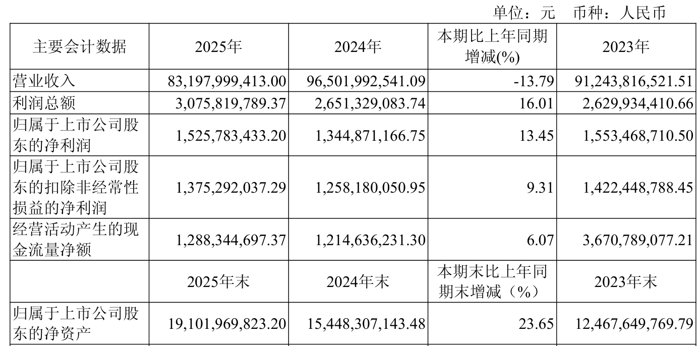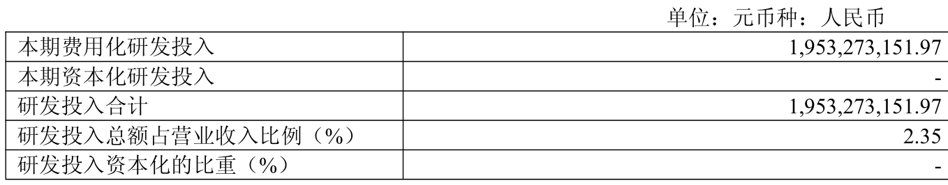 2025年全年,公司研发投入金额为19.53亿元,同比下降8.92%;研发投入占营业收入比例为2.35%,相比上年同期上升0.13个百分点。此外,公司全年研发投入资本化率为0%。