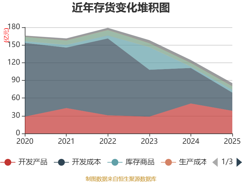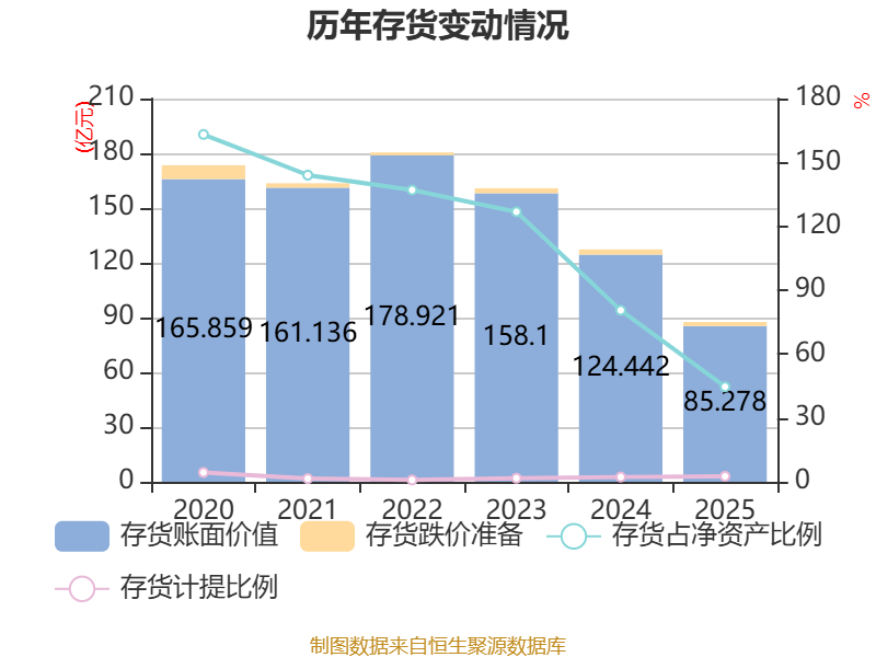 从存货变动来看,截至2025年末,公司存货账面价值为85.28亿元,占净资产的44.64%,较上年末减少39.16亿元。其中,存货跌价准备为2.27亿元,计提比例为2.59%。