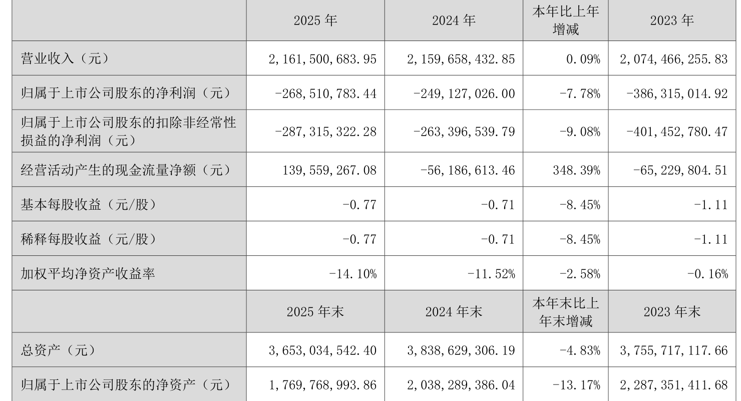 中证智能财讯民和股份(002234)3月28日披露2025年年度报告。2025年,公司实现营业总收入21.62亿元,同比增长0.09%;归母净利润亏损2.69亿元,上年同期亏损2.49亿元;扣非净利润亏损2.87亿元,上年同期亏损2.63亿元;经营活动产生的现金流量净额为1.4亿元,上年同期为-5618.66万元;报告期内,民和股份基本每股收益为-0.77元,加权平均净资产收益率为-14.10%。