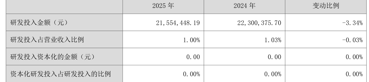 2025年全年,公司研发投入金额为2155.44万元,同比下降3.34%;研发投入占营业收入比例为1%,相比上年同期下降0.03个百分点。此外,公司全年研发投入资本化率为0%。
