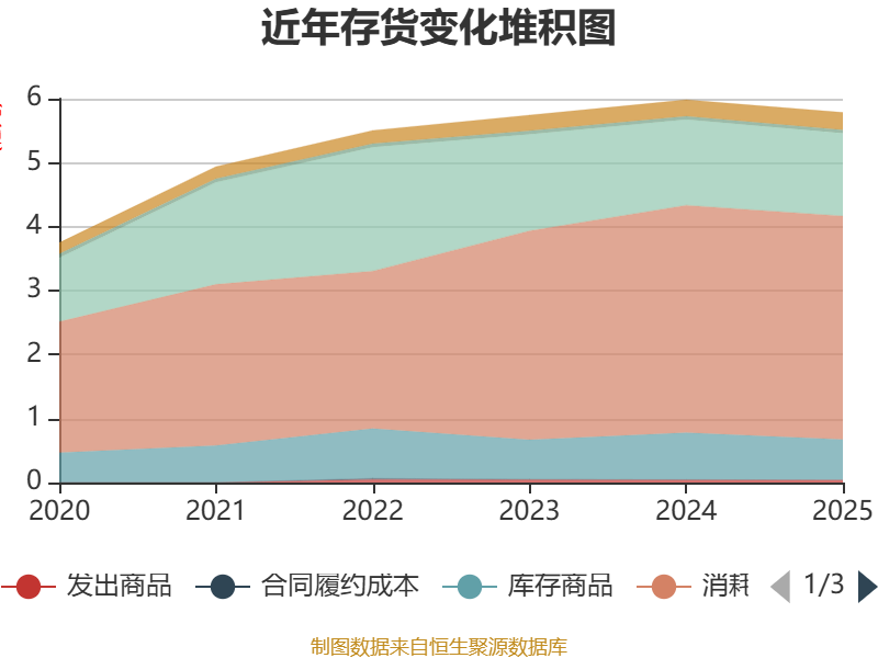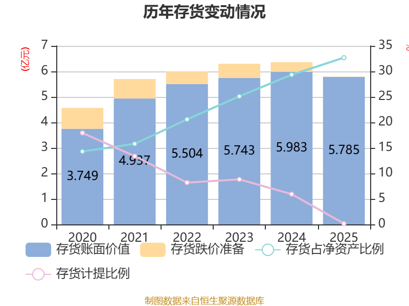 从存货变动来看,截至2025年末,公司存货账面价值为5.79亿元,占净资产的32.69%,较上年末减少1974.95万元。其中,存货跌价准备为96.2万元,计提比例为0.17%。