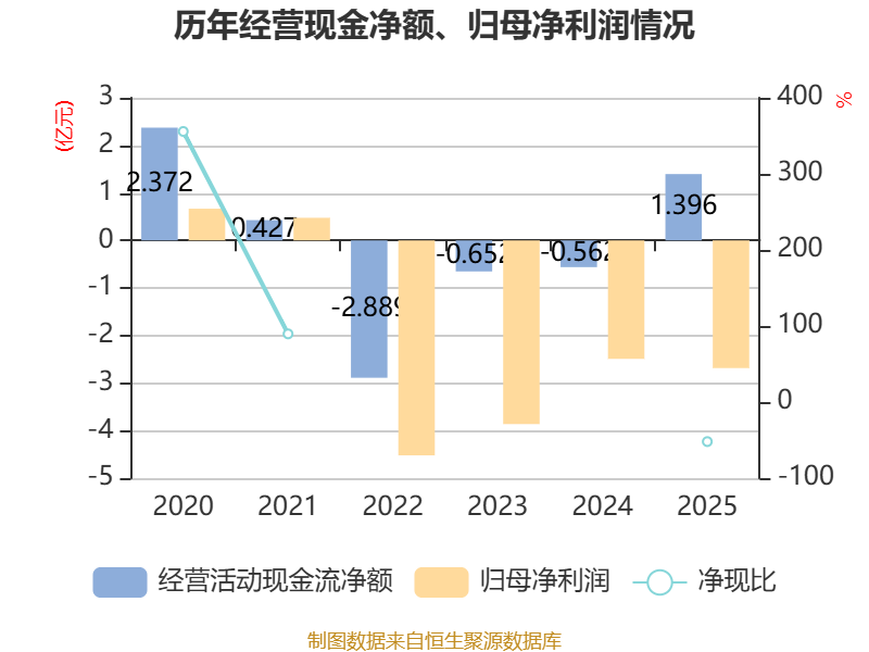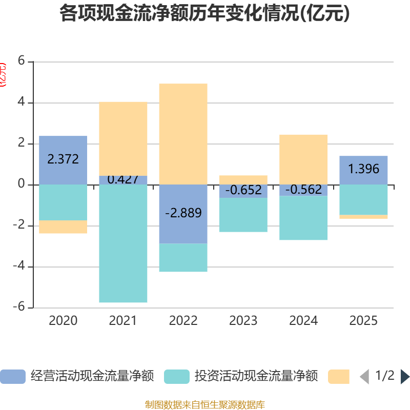 截至2025年,公司经营活动现金流净额为1.4亿元,同比增加1.96亿元;筹资活动现金流净额-1844.87万元,同比减少2.61亿元;投资活动现金流净额-1.49亿元,上年同期为-2.15亿元。