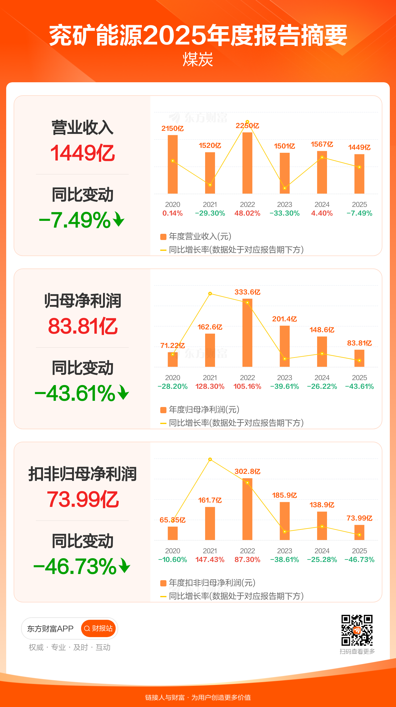 兖矿能源3月28日发布2025年年报显示,公司全年实现营业收入1449.33亿元,同比下滑7.49%;归母净利润83.81亿元,同比下滑43.61%;扣非归母净利润73.99亿元,同比下滑46.73%。