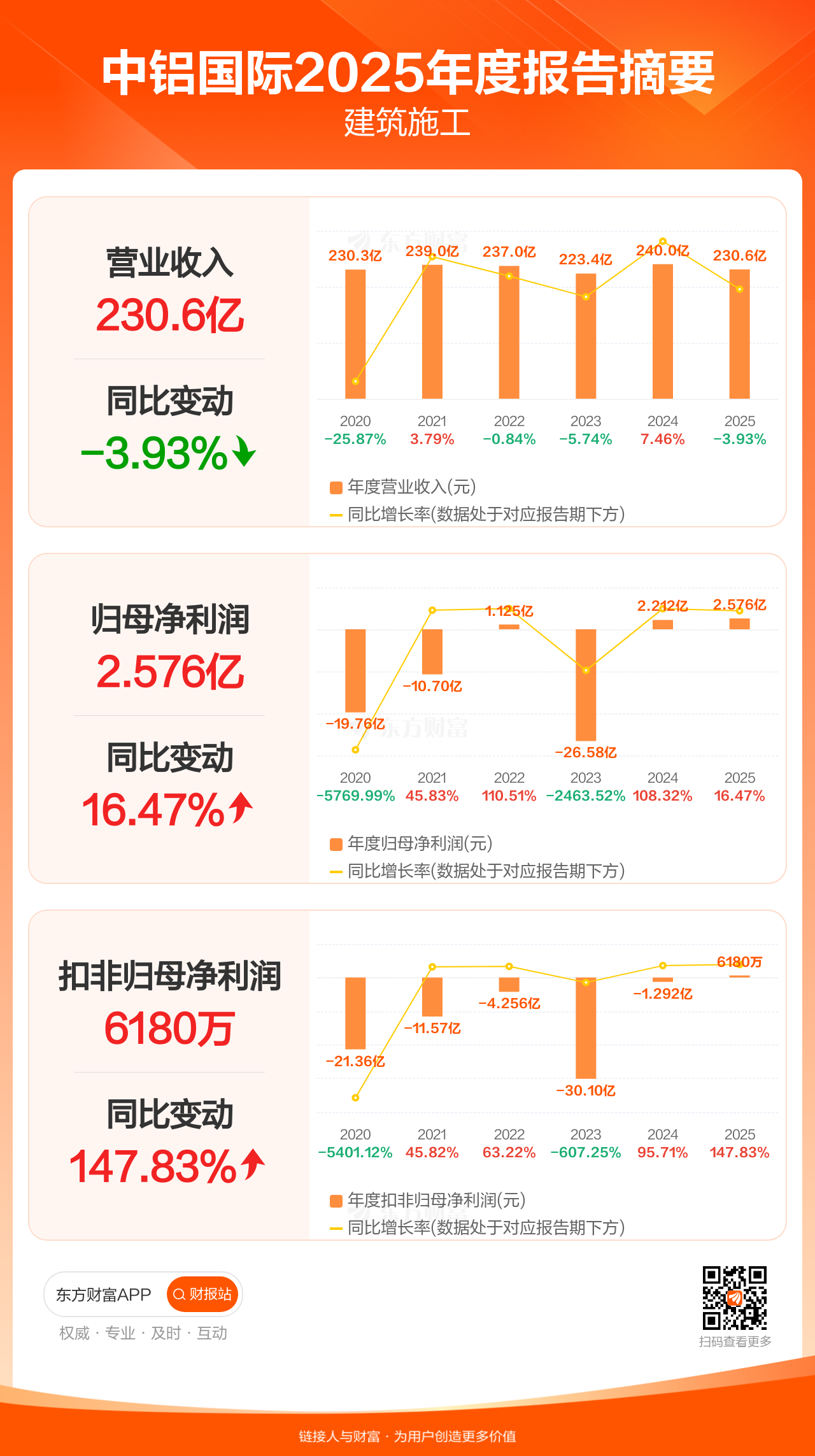中铝国际3月28日发布2025年年报显示,公司全年实现营业收入230.60亿元,同比下滑3.93%;归母净利润2.58亿元,同比增长16.47%;扣非归母净利润6179.60万元,同比增长147.83%。每股EPS0.04元,低于机构一致预测的0.09元。