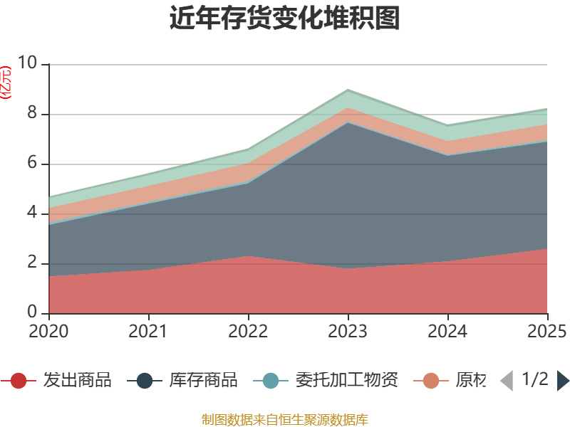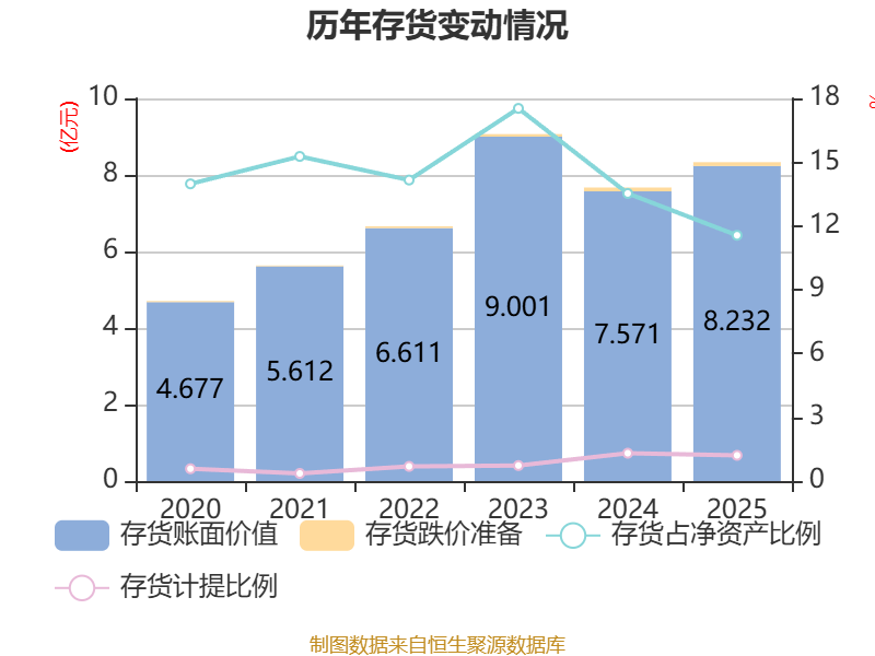 从存货变动来看,截至2025年末,公司存货账面价值为8.23亿元,占净资产的11.56%,较上年末增加6617.88万元。其中,存货跌价准备为1005.45万元,计提比例为1.21%。