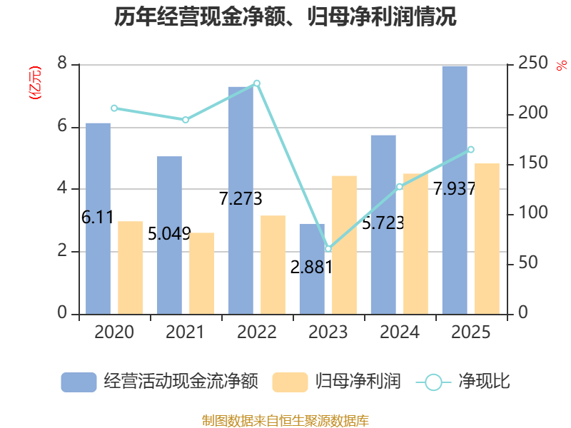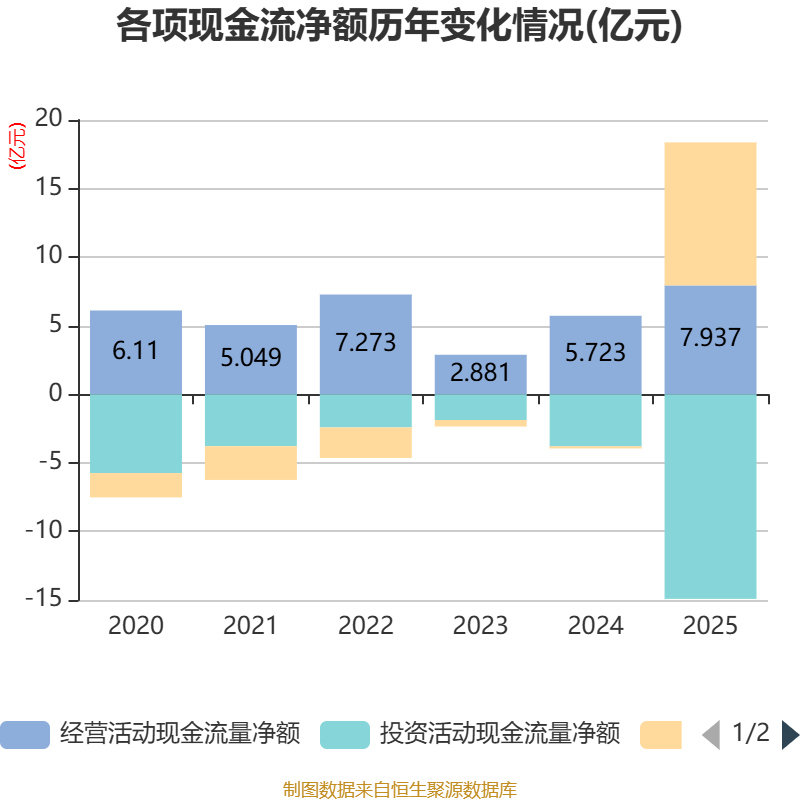截至2025年,公司经营活动现金流净额为7.94亿元,同比增长38.69%;筹资活动现金流净额10.43亿元,同比增加10.59亿元;投资活动现金流净额-14.92亿元,上年同期为-3.79亿元。