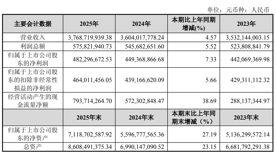 中证智能财讯威高血净(603014)3月28日披露2025年年度报告。2025年,公司实现营业总收入37.69亿元,同比增长4.57%;归母净利润4.82亿元,同比增长7.33%;扣非净利润4.64亿元,同比增长5.66%;经营活动产生的现金流量净额为7.94亿元,同比增长38.69%;报告期内,威高血净基本每股收益为1.22元,加权平均净资产收益率为7.45%。公司2025年度分配预案为:拟向全体股东每10股派现3.608元(含税)。