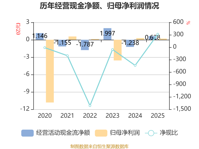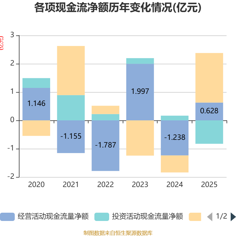 截至2025年,公司经营活动现金流净额为6279.32万元,同比增加1.87亿元;筹资活动现金流净额1.75亿元,同比增加2.35亿元;投资活动现金流净额-8271.79万元,上年同期为1656.36万元。