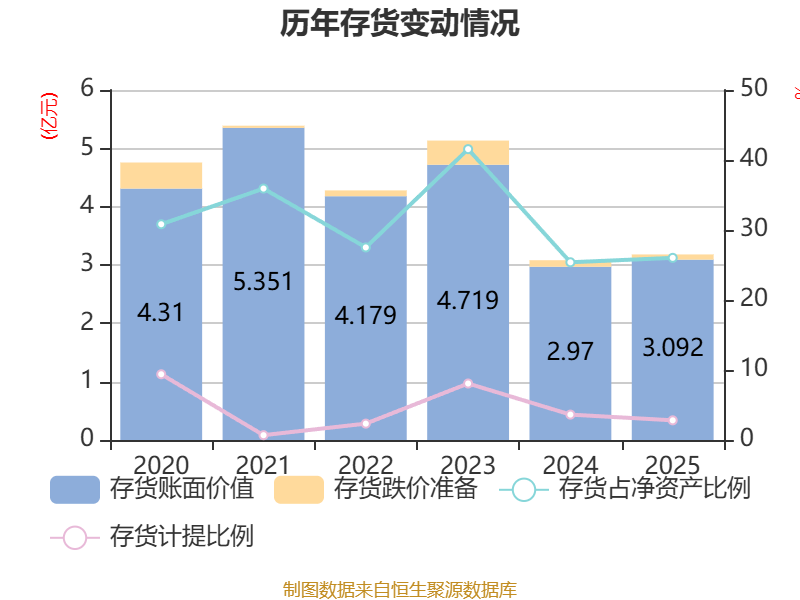 从存货变动来看,截至2025年末,公司存货账面价值为3.09亿元,占净资产的26.02%,较上年末增加1221.1万元。其中,存货跌价准备为892.57万元,计提比例为2.81%。