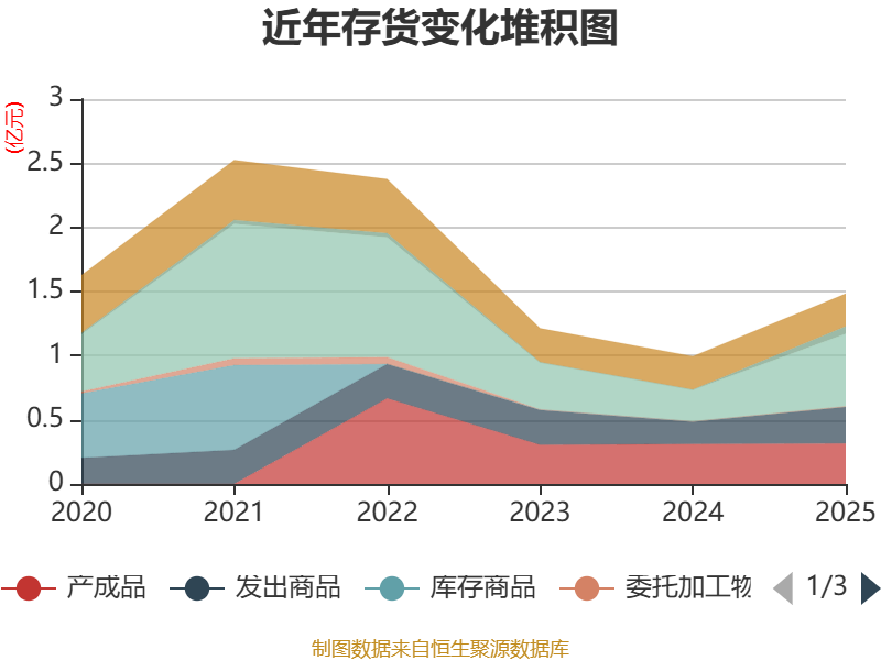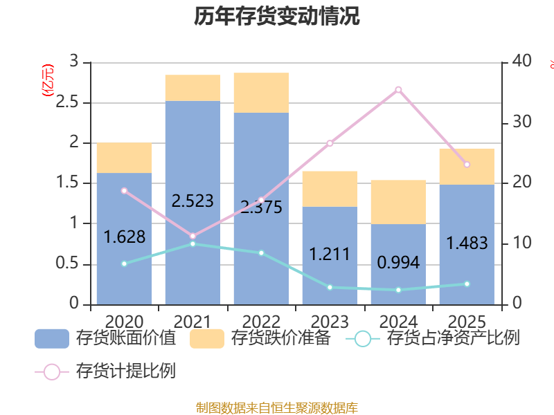 从存货变动来看,截至2025年末,公司存货账面价值为1.48亿元,占净资产的3.37%,较上年末增加4885.63万元。其中,存货跌价准备为4455.39万元,计提比例为23.1%。