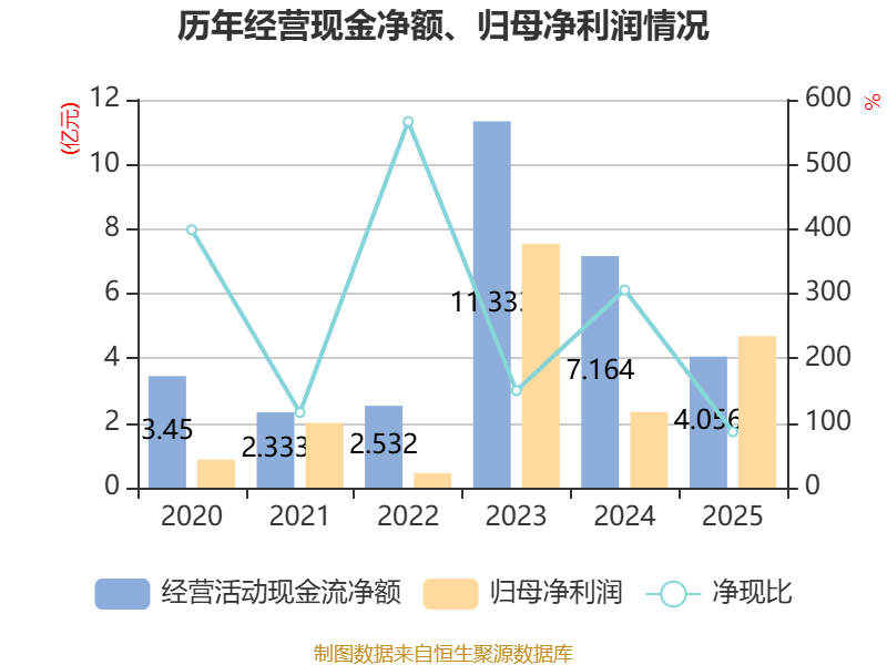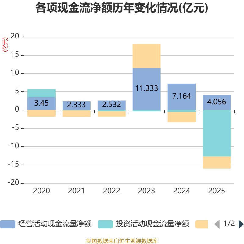 截至2025年,公司经营活动现金流净额为4.06亿元,同比下降43.39%;筹资活动现金流净额-3.28亿元,同比减少5038.5万元;投资活动现金流净额-12.8亿元,上年同期为-5929.08万元。