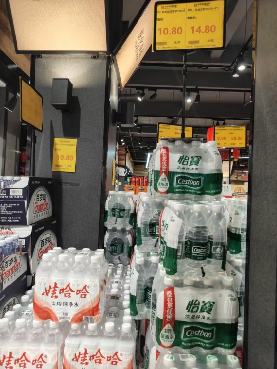 某超市内娃哈哈与怡宝包装水产品堆头( 夏天摄)