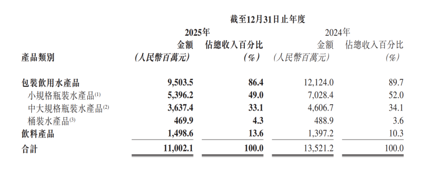 华润饮料的饮料业务仍在艰难突围。2025年,公司饮料产品收入为14.99亿元,同比增长7.3%,占总收入的13.6%。尽管增速尚可,但绝对值仍与农夫山泉相去甚远。