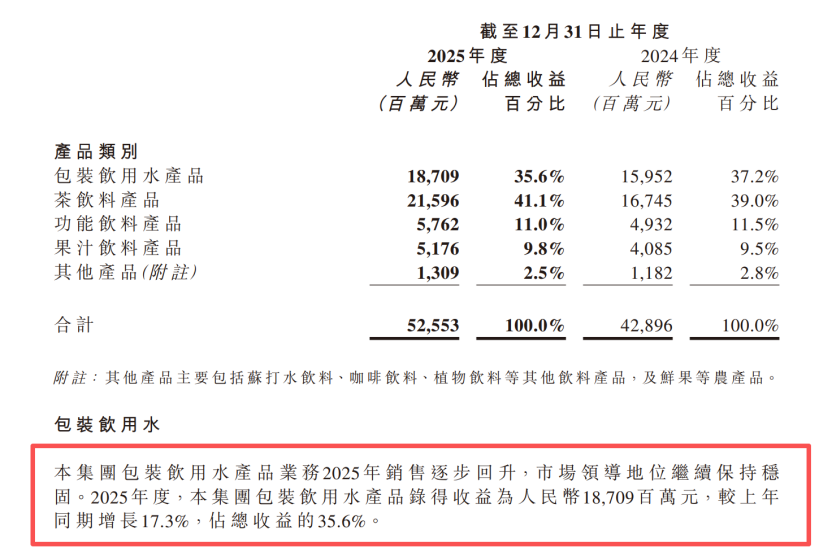这意味着,在2024年遭受舆情冲击、包装水业务同比下滑21.3%之后,农夫山泉包装水业务已逐步回升。