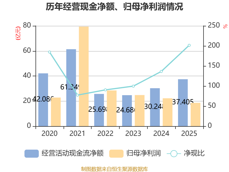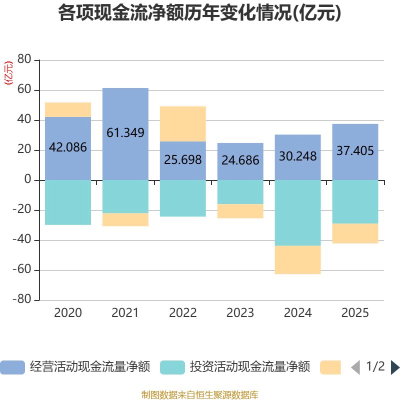 截至2025年,公司经营活动现金流净额为37.4亿元,同比增长23.66%;筹资活动现金流净额-13.2亿元,同比增加5.67亿元;投资活动现金流净额-29.11亿元,上年同期为-43.89亿元。