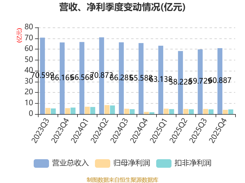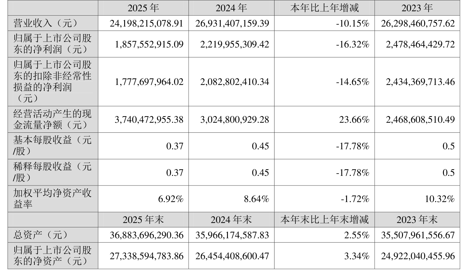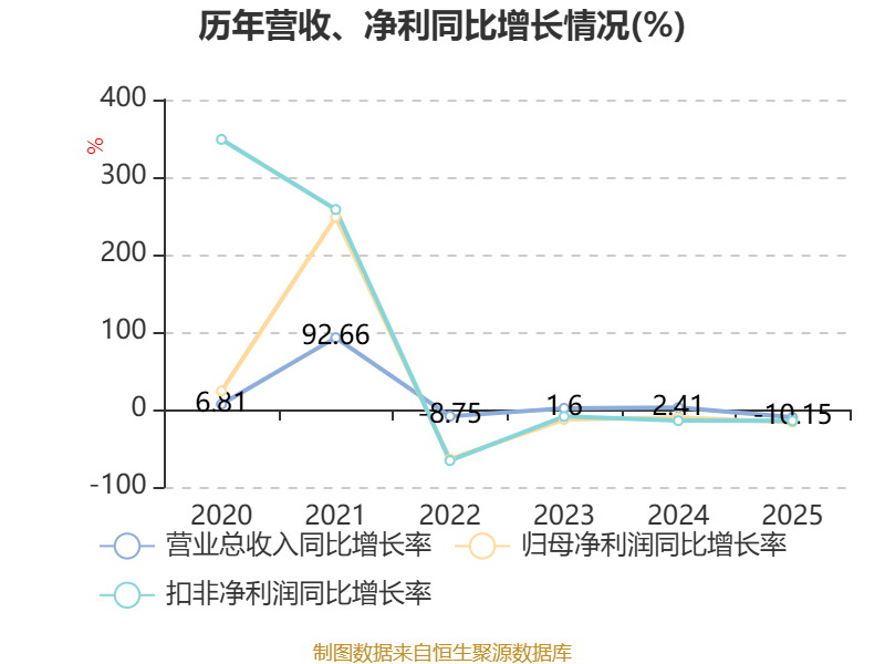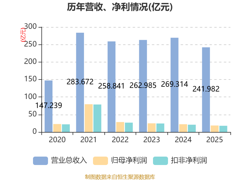 中证智能财讯华峰化学(002064)3月28日披露2025年年度报告。2025年,公司实现营业总收入241.98亿元,同比下降10.15%;归母净利润18.58亿元,同比下降16.32%;扣非净利润17.78亿元,同比下降14.65%;经营活动产生的现金流量净额为37.4亿元,同比增长23.66%;报告期内,华峰化学基本每股收益为0.37元,加权平均净资产收益率为6.92%。公司2025年度分配预案为:拟向全体股东每10股派现1元(含税)。