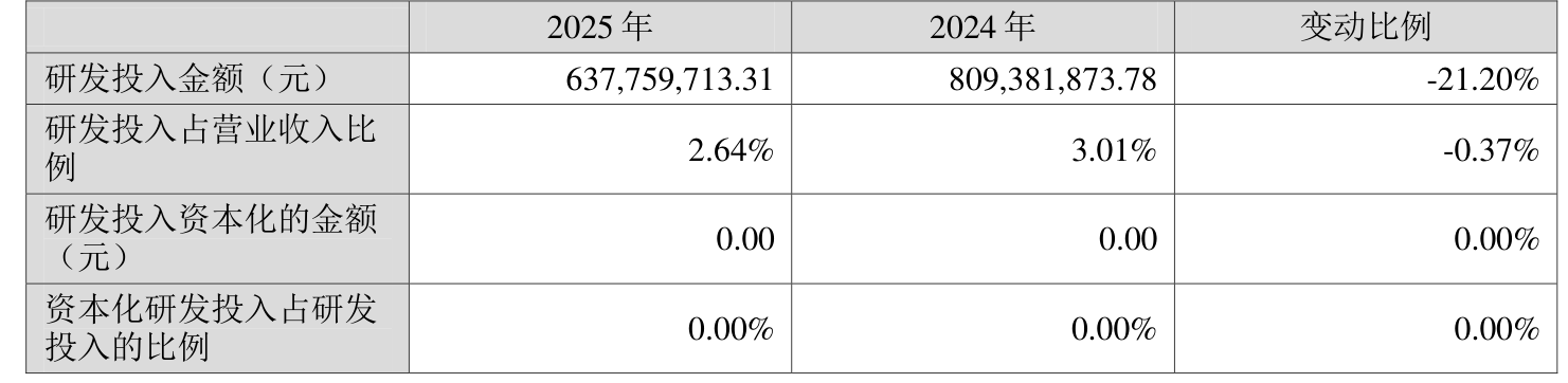 2025年全年,公司研发投入金额为6.38亿元,同比下降21.2%;研发投入占营业收入比例为2.64%,相比上年同期下降0.37个百分点。此外,公司全年研发投入资本化率为0%。