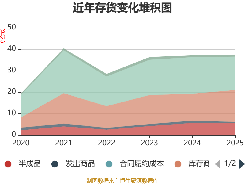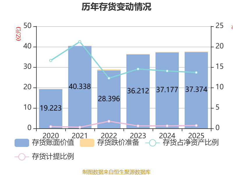 从存货变动来看,截至2025年末,公司存货账面价值为37.37亿元,占净资产的13.67%,较上年末增加1968.88万元。其中,存货跌价准备为2635.16万元,计提比例为0.7%。
